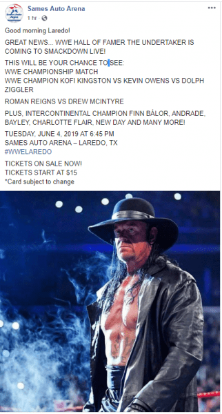 Fans around Laredo Texas where SmackDown Live is taking place this week are seeing something very interesting. Because Sames Auto Arena is advertising that The Undertaker will be there this week for SmackDown as well.