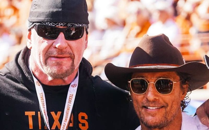 The Texas Longhorns’ official Instagram account took to the social media platform and uploaded a couple of photos of The Undertaker meeting up with Matthew McConaughey at the Longhorns’ current game against the Florida Gators at the Darrell K Royal Memorial Stadium.