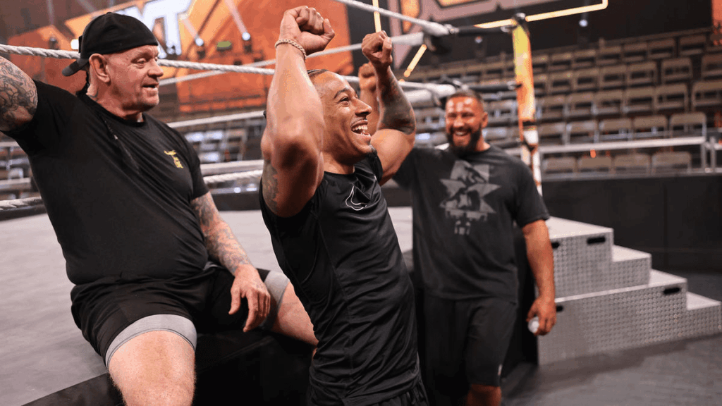 WWE’s official website uploaded several behind-the-scenes photos of NXT this past week, which included a photo of The Undertaker laughing it up with Bron Breakker and Carmelo Hayes before their segment on NXT this week.