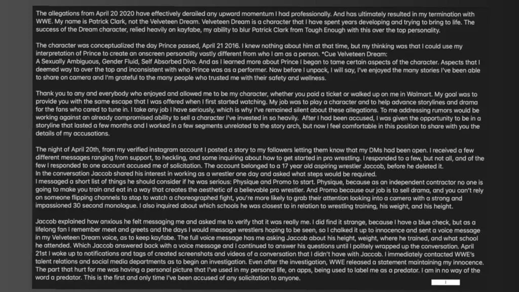 The allegations from April 20 2020 have effectively derailed any upward momentum I had professionally. And has ultimately resulted in my termination with WWE. My name is Patrick Clark, not the Velveteen Dream. Velveteen Dream is a character that I have spent years developing and trying to bring to life. The success of the Dream character, relied heavily on kayfabe, my ability to blur Patrick Clark from Tough Enough with this over the top personality.