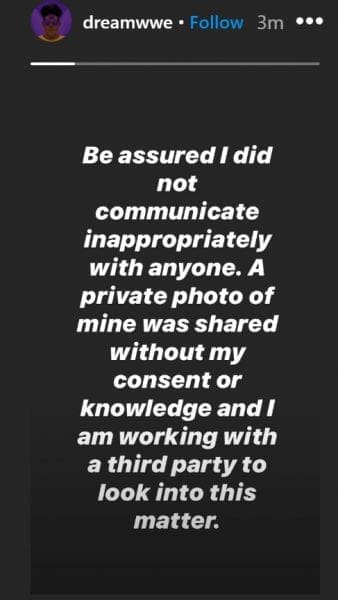 In a statement posted to his Instagram story, Velveteen Dream denied all accusations against him. He stated that a private photo was stolen from him and shared without his consent. He is currently working with a third party to “look into this matter.”
