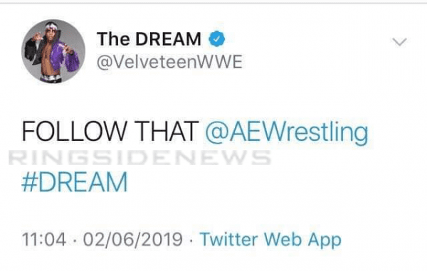 After TakeOver was over, Velveteen Dream tweeted out: “FOLLOW THAT AEW WRESTLING #DREAM.” You can see a screenshot of the tweet below.