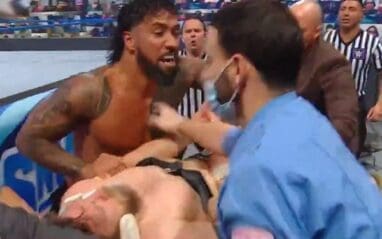 After SmackDown went off the air this week, the assault continued. WWE uploaded video showing the aftermath, and it wasn’t pretty. The ThunderDome crowd watched on as Jey Uso’s assault continued on Daniel Bryan.