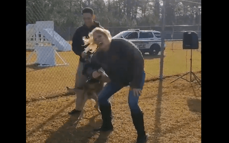 The Lady Of WWE uploaded a video to social media of herself playing attack dummy for a bit. The Marines’ Military Police K9s don’t mess around as she wrote about the experience: