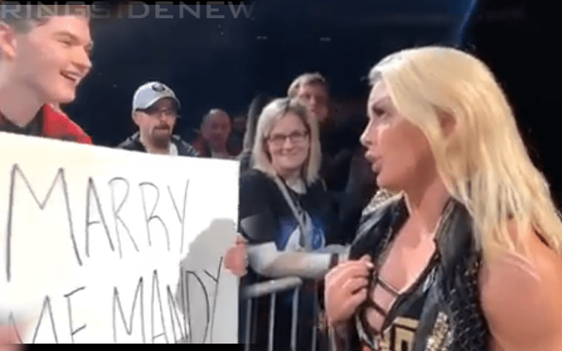 At a recent WWE live event, Mandy Rose came out and spotted a fan right on the aisle who had a sign for her. The sign proposed marriage and she asked who wouldn’t want to marry her.
