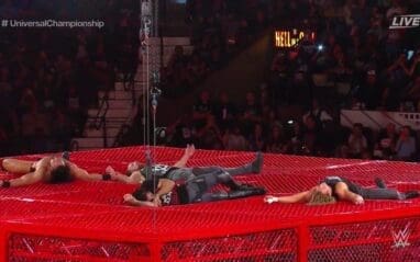 The four men who had previously battled in the Raw Tag Team Championship match brawled around the ring and then eventually Seth and Dolph climbed the cell. Drew followed and they double-teamed Seth for a bit until Dean climbed up with a kendo stick in tow and then he laid everyone out.