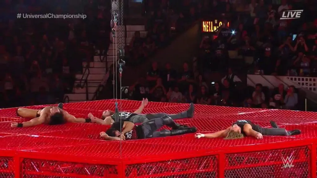 During the main event of Hell In A Cell, Braun Strowman and Roman Reigns were giving each other everything they could. Then Dolph Ziggler and Drew McIntyre came down to see if there is anything they could do to help. This was soon met with Seth Rollins and Dean Ambrose coming down to fight them off