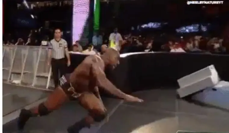 Titus tripped and went flying as he reached the bottom of the ramp. He then went flying forward and slid all the way under the ring. It’s a wonder he wasn’t hurt, but he was certainly upset about it.
