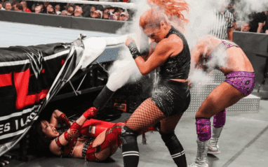 Thankfully, Becky Lynch rolled Kairi Sane under the ring to hide her like an injured solider during a firefight. We previously reported that Vince McMahon and Triple H were not at WWE TLC so Paul Heyman and Bruce Prichard were running things from the back.