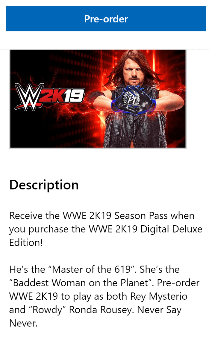 While it has not been officially announced by the WWE, Microsoft’s website is listing Ronda Rousey as a special WWE 2K19 pre-order character.
