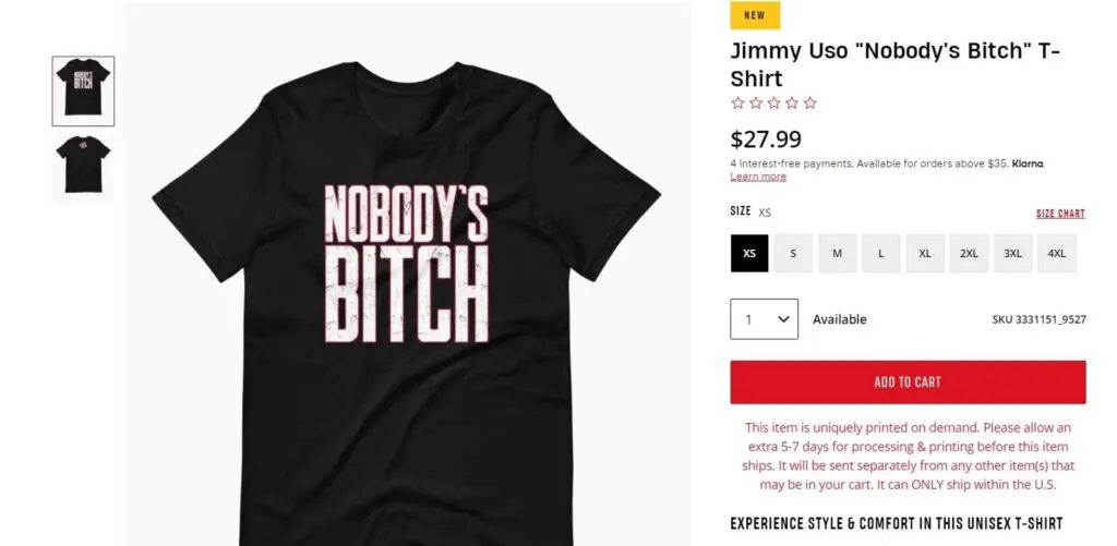 Jimmy Uso’s new “Nobody’s Bitch” t-shirt is on sale at WWE’s official shop. For $28, it can now be your new favorite “going out” t-shirt. This doesn’t look like a situation where the t-shirt is getting printed in mass quantities. It is listed as one of their print on demand options.