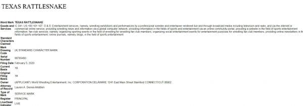 WWE registered for a trademark on “Texas Rattlesnake” on February 5th. This trademark is for use during pro wrestling matches as well.