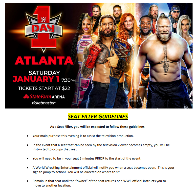 The State Farm Arena in Atlanta has posted guidelines for the position. There are some interesting tidbits included. Everybody already knows that WWE and other promotions use seat fillers. WWE doesn’t want that already public knowledge known.