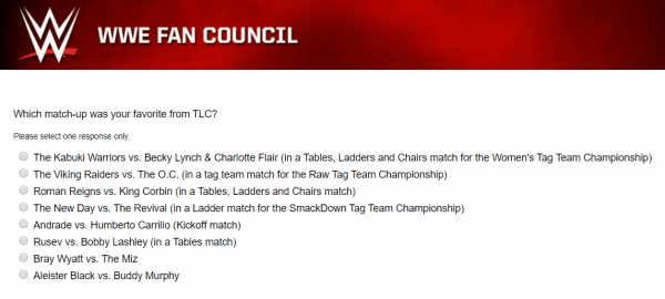 They wanted to know fans’ favorite match and if TLC met fans’ expectations. There was also an option to write-in their reasoning. This was followed by WWE asking fans a list of questions about what they thought of the event.