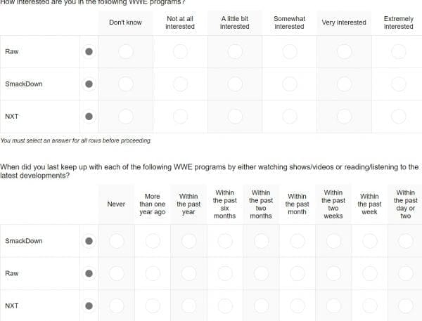 The WWE Fan Council sent out a very short survey this week. They asked fans to rate RAW, SmackDown, and NXT’s storylines and matches. Prior to asking how they are doing, they asked a qualifying question regarding if the participants actually watch the shows.