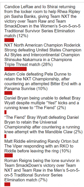 This was followed by a list of “unexpected moments” and the survey asked participants to pick which moment they thought was the most shocking. You can see those results below. So far Roderick Strong beating AJ Styles and Shinsuke Nakamura is leading with 28% of the vote.