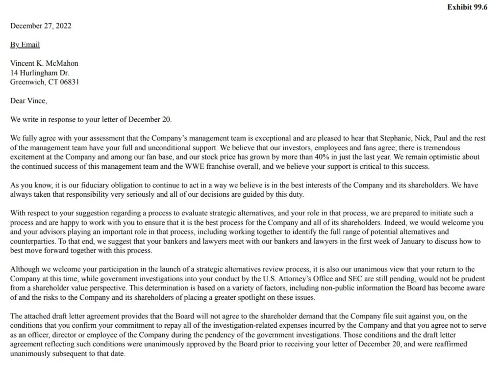 The Board’s response. “…it is also our unanimous view that your return to the Company at this time, while government investigations into your conduct by the U.S. Attorney’s Office and SEC are still pending, [Vince McMahon returning] would not be prudent from a shareholder value perspective.”