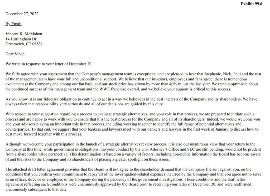 The Board's response. "...it is also our unanimous view that your return to the Company at this time, while government investigations into your conduct by the U.S. Attorney’s Office and SEC are still pending, [Vince McMahon returning] would not be prudent from a shareholder value perspective."