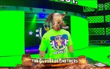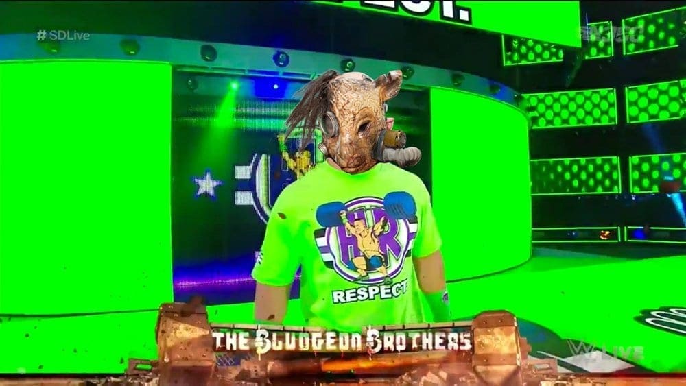 When the returning WWE Superstar was making his entrance to the ring, someone working in production slipped up and used the graphics for The Bludgeon Brothers instead of Cena’s graphics. You can check out the error below: