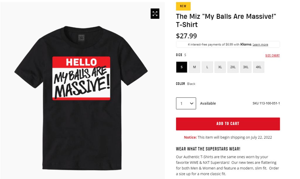 As Miz prepares to take on Logan Paul at WWE’s upcoming SummerSlam premium live event, his latest merch is based on the size of his balls. WWE’s official shop has a new t-shirt up for preorder. It shares the same message that Miz has been trying to get across for weeks.