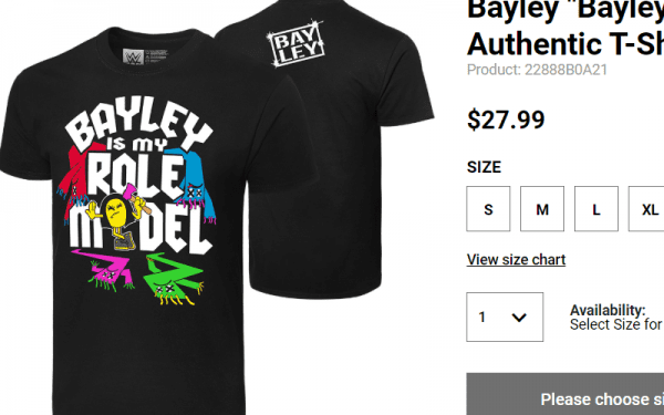 The shirt proudly proclaims: “Bayley is my role model” as the Hugger’s former smiling emoji is now holding a pink weapon after slaying a room of Bayley Buddies.