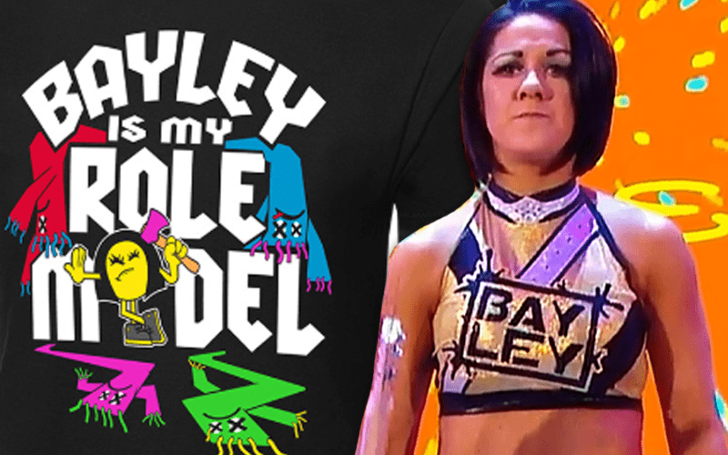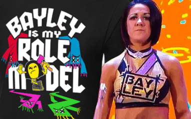 The shirt proudly proclaims: “Bayley is my role model” as the Hugger’s former smiling emoji is now holding a pink weapon after slaying a room of Bayley Buddies.