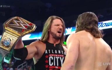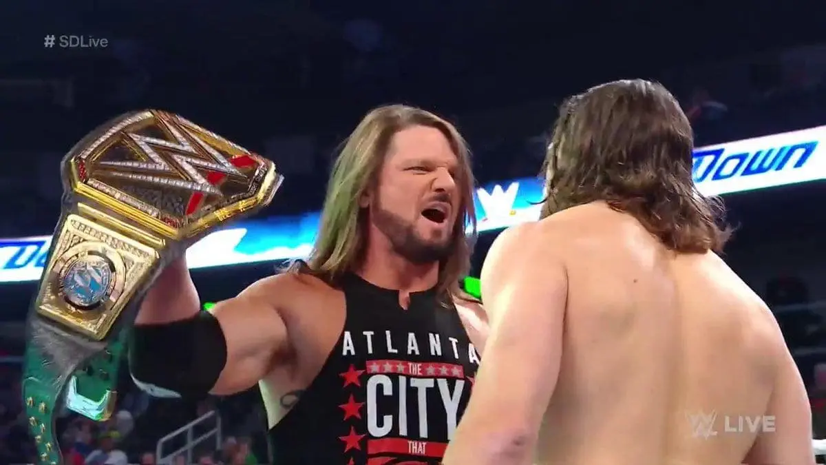 AJ Styles came to the ring followed by Daniel Bryan. After the two of them exchanged words a little bit — AJ Styles admitted that he meant to kick Daniel Bryan last week. Then he proposed they have their championship match on the spot.