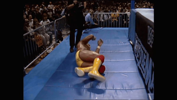 You can see a photo comparison below showing the difference between the two versions. This capture was taken as Hogan was shoved out of the ring by Andre as he stopped him from heating up. Hogan’s legs are in the process of falling in the shot, but they are taken within the same second right before Gorilla Monsoon said: “Out onto the floor.”