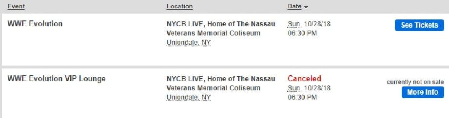 WWE was planning for a WWE Evolution VIP Lounge at the Nassau Veterans Memorial Coliseum, but it appears that event has been canceled. The Ticketmaster website is no longer selling tickets to the event and promises refunds for anyone who bought one.