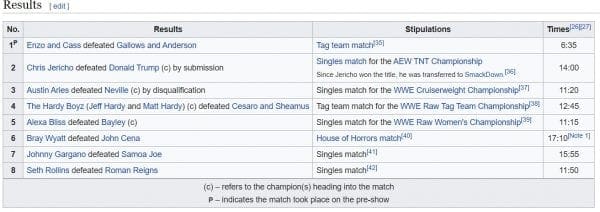 Also, Johnny Gargano didn’t defeat Samoa Joe either. Joe lost to Seth Rollins that night. Braun Strowman defeated Roman Reigns instead of the Rollins vs Reigns match that is on Wikipedia.