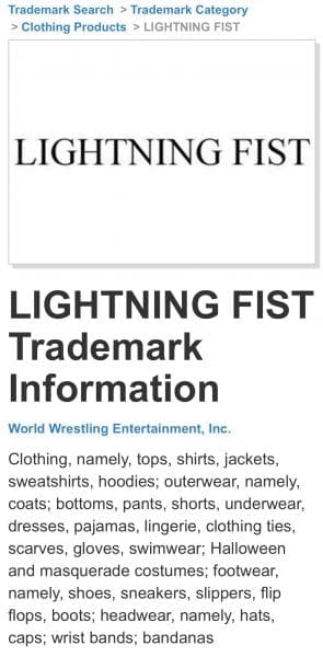 WWE has registered a trademark for “Lightning Fist” now with plans to use it on a slew of merchandise and other marketing. It looks like this one will be theirs so nobody can take it out from under them.