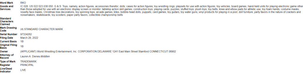 The RKO filing appears to be mainly for use in merchandise sales. As always, a ton of different items are listed, although many or most will never be produced. WWE is just covering their bases. You can check out the description below: