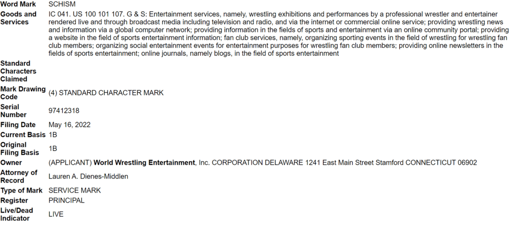 The company has trademarks “Sol Ruca,” “Dyad,” and “Schism.” It is not known how WWE plans to use the names. Typically, new WWE trademarks end up debuting on NXT in fairly short order.