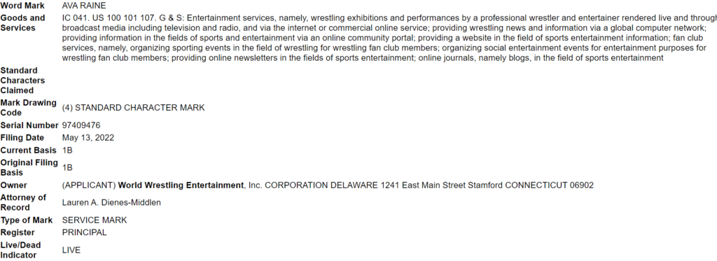 The latest, filed with the US Patent and Trademark Office on May 12, is for the name “Ava Raine.” Thus far, nobody has used the moniker, so it will be interesting to see who winds up with the new name. WWE frequently debuts wrestlers shortly after filing for trademarks, so we should know soon.