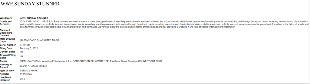 The latest filing is for the name “WWE Sunday Stunner.” The trademark is otherwise unremarkable and follows the standard WWE trademark protocols. Protection was filed for the name on February 3, 2022. The entire description is as follows: