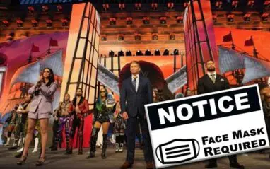 Ringside News was told by a tenured member of the backstage team that all Superstars and staff are under a “24/7 mask mandate except while eating or drinking.” That applies to everyone without exception.