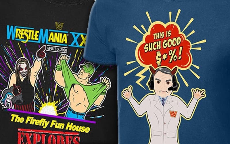 The other t-shirt looks like a play off an old WrestleMania event poster. They even used roman numerals to indicate it was WrestleMania 36. Both Cena and Wyatt are featured at WrestleMania XXVII as “The Firefly Fun House Explodes.”