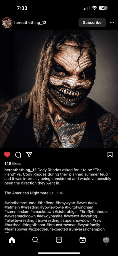 A report is going around the internet about cancelled Bray Wyatt plans. The new word making the rounds is that, “Cody Rhodes asked for it to be ‘The Fiend’ vs Cody Rhodes during their planned Summer feud, and it was internally being considered and would’ve possibly been the direction they went in.” We can confirm that this is 100% fake.