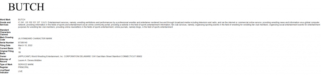 The first new trademark is for the name “Butch.” This is the new name given to Pete Dunne. Dunne debuted the new moniker on SmackDown.
