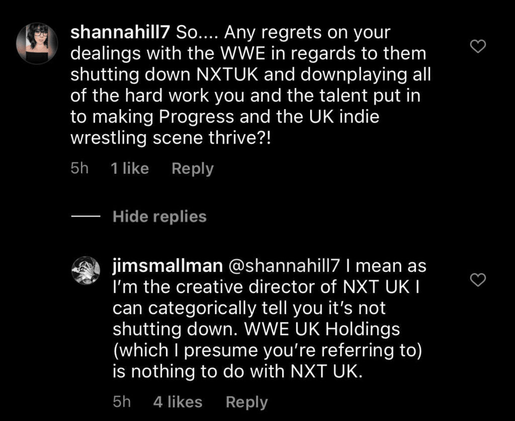 “I mean as I’m the creative director of NXT UK I can categorically tell you it’s not shutting down. WWE UK Holdings (which I presume you’re referring to) is nothing to do with NXT UK.”