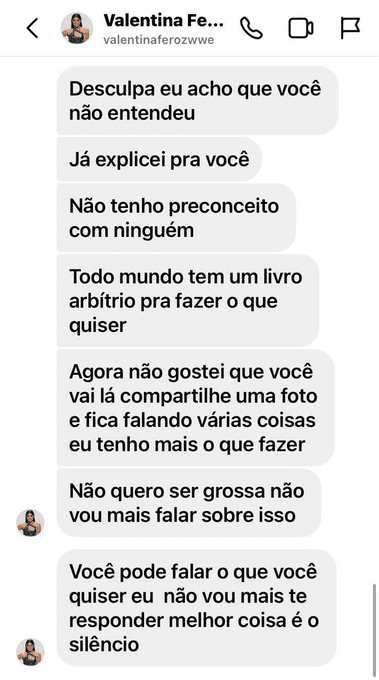 "Sorry, I think you misunderstood. I already explained to you I have no prejudice with anyone. Everyone has a free will to do what they want. Now I don't like that you go there and share a photo and keep saying a lot of things. I have more to do. I don't want to be rude, I won't talk about it anymore. You can say whatever you want. I won't answer you anymore. The best thing is silence.”