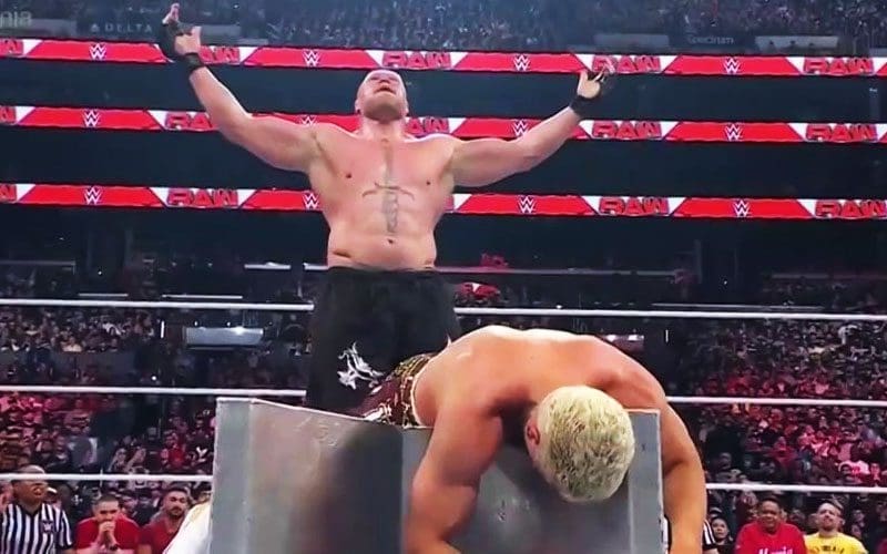 As seen on this week’s post-WrestleMania 39 edition of Monday Night RAW, Brock Lesnar attacked Cody Rhodes during a tag team match pitting Lesnar and Rhodes against Roman Reigns and Solo Sikoa. The match was made after Rhodes demanded a rematch against Reigns for the Undisputed WWE Universal Championship, which Reigns refused.