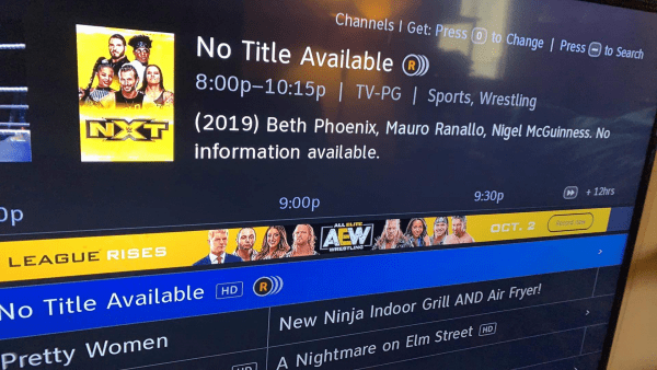 You can check out a screenshot that we took below. It is interesting how AEW bought up a bar to advertise on DirecTV’s guide which you can see from the image as well. Also, it is worth nothing that they changed the time so recently that the name of the NXT show hasn’t had time to update in DirecTV’s system either.