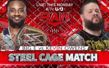 Big E is backstage as well and he says he’s been to Hell and back to be WWE Champion and tonight will be no different. Tonight there will be no shortcuts or easy way out, and he will punish Kevin Owens. We go live to the arena and the steel cage is already surrounding the ring and out comes Big E.