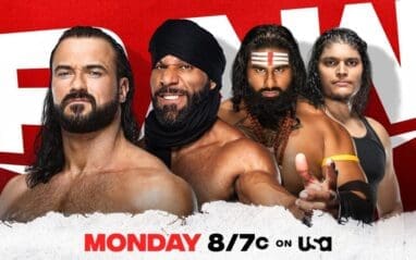 Jinder Mahal, Veer and Shanky are in the ring with a pedestal draped in cloth. Jinder says he may have taken things too far last week. He knows how much Drew appreciates his Scottish heritage so he’s going to be the bigger man and extend an olive branch. He asks Drew to come out, shake hands, and he’ll hand the sword back.