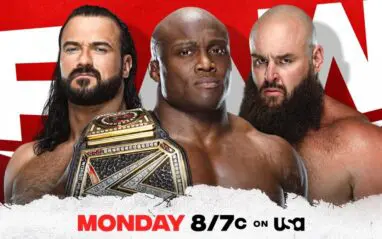 We see a clip from earlier today with Adam Pearce, Sonya Deville, and MVP backstage. Adam Pearce is going to flip a coin to decide who will face Bobby Lashley tonight but Drew McIntyre and Braun Strowman walk in and start bickering. Pearce tells them to save it for Backlash, then Braun wins the coin flip and so he faces Lashley tonight. MVP tells Braun he shouldn’t be so excited because the All Mighty will put Braun in the Hurt Lock tonight and he won’t make it to Backlash.
