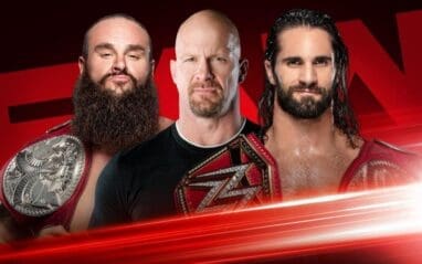 Stone Cold gets to the matter at hand and says last week’s Raw saw the contract signing descend into chaos, so he’s here to play the intermediary. He asks the fans if they want to see this contract signed and they give a rapturous “Hell Yeah!” Austin introduces one half of the Raw Tag Team Champions, Braun Strowman. The Monster Among Men extends his hand for a shake and Austin stares at him, prompting the fans to chant “Austin!” He doesn’t shake Braun’s hand, instead introduces the other half of the Raw Tag Team Champions, and the Universal Champion, Seth Rollins.