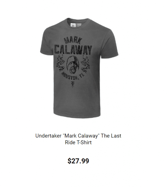 A new t-shirt on WWE’s official shop says : “Mark Calaway Houston, TX” on it with an image of his face in the center. There is no mention of The Undertaker except for his tiny insignia at the bottom of the graphic.