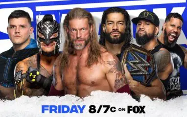 SmackDown’s opening match begins with Jey Uso with a surprise attack on Edge. Edge makes a quick tag to Dominik who makes another quick tag to Rey. Jey counters an arm drag with a forearm shot and Jimmy and Edge are tagged in. Edge works over the right arm of Jimmy as Rey is tagged in. Rey hits a senton and covers for a two count. Dominik hits a middle rope moonsault and covers for two. Dominik puts Jimmy in an armbar. Jimmy and Dominik exchange forearms as Jey Uso makes the blind tag. Jey gets Dominik down in the corner and Reigns tags in. Reigns drags Doninik to the outside, back inside Reigns hits a vertical suplex and covers for two. Dominik rolls to the outside and Reigns slams Dominik’s head off the announce table. Reings hits a power bomb to the announce table on Dominik.