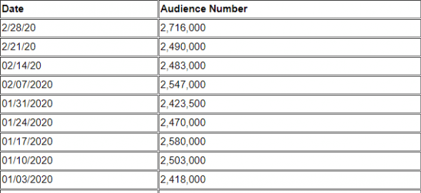 Hour number one brought in 2.736 million viewers with 2.697 keeping the channel on FOX for the second hour.